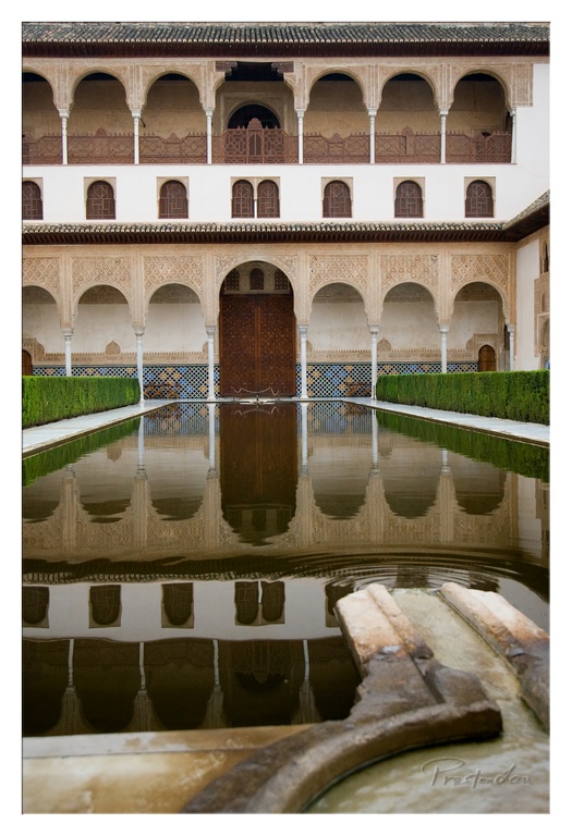 This photograph captures the serene grandeur of a Moorish courtyard, where water, architecture, and greenery converge in harmonious balance. The long central fountain draws the eye toward the ornate arches and tiled façade, evoking a sense of timelessness and quiet contemplation. While the overcast sky tempers the warmth of the scene, the composition’s symmetry and depth lend it a cinematic elegance that elevates it beyond mere documentation.