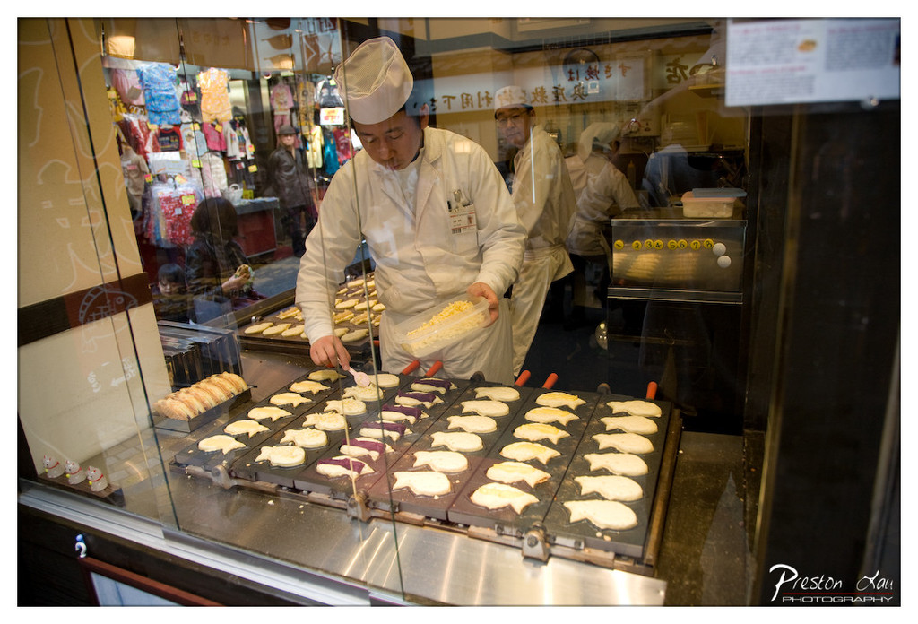 This photograph captures the lively rhythm of a Japanese fish-shaped pancake (taiyaki) vendor at work, with a compelling blend of action, texture, and cultural authenticity. The glass reflection adds layers to the scene, merging the interior of the kitchen with the bustling street outside. While the composition is slightly cluttered, the candid energy and focus on the artisan at work elevate it beyond mere documentation into a vivid slice of urban life.
