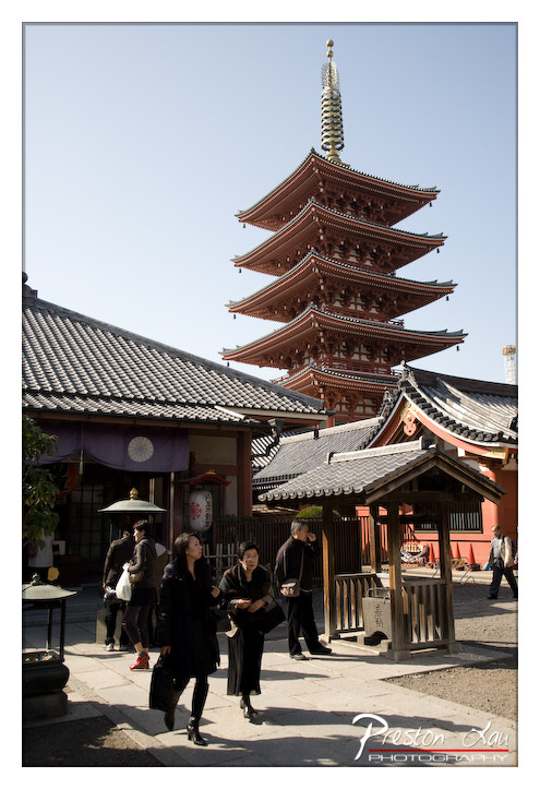 This photograph captures the serene grandeur of a traditional Japanese temple complex, where ancient architecture meets the quiet rhythm of daily life. The five-tiered pagoda rises with elegant symmetry against a clear blue sky, while visitors stroll through the courtyard, grounding the scene in human scale and movement. While the composition is strong and the subject compelling, the slightly flat lighting and muted color palette temper its emotional resonance, holding it just short of transcendent.