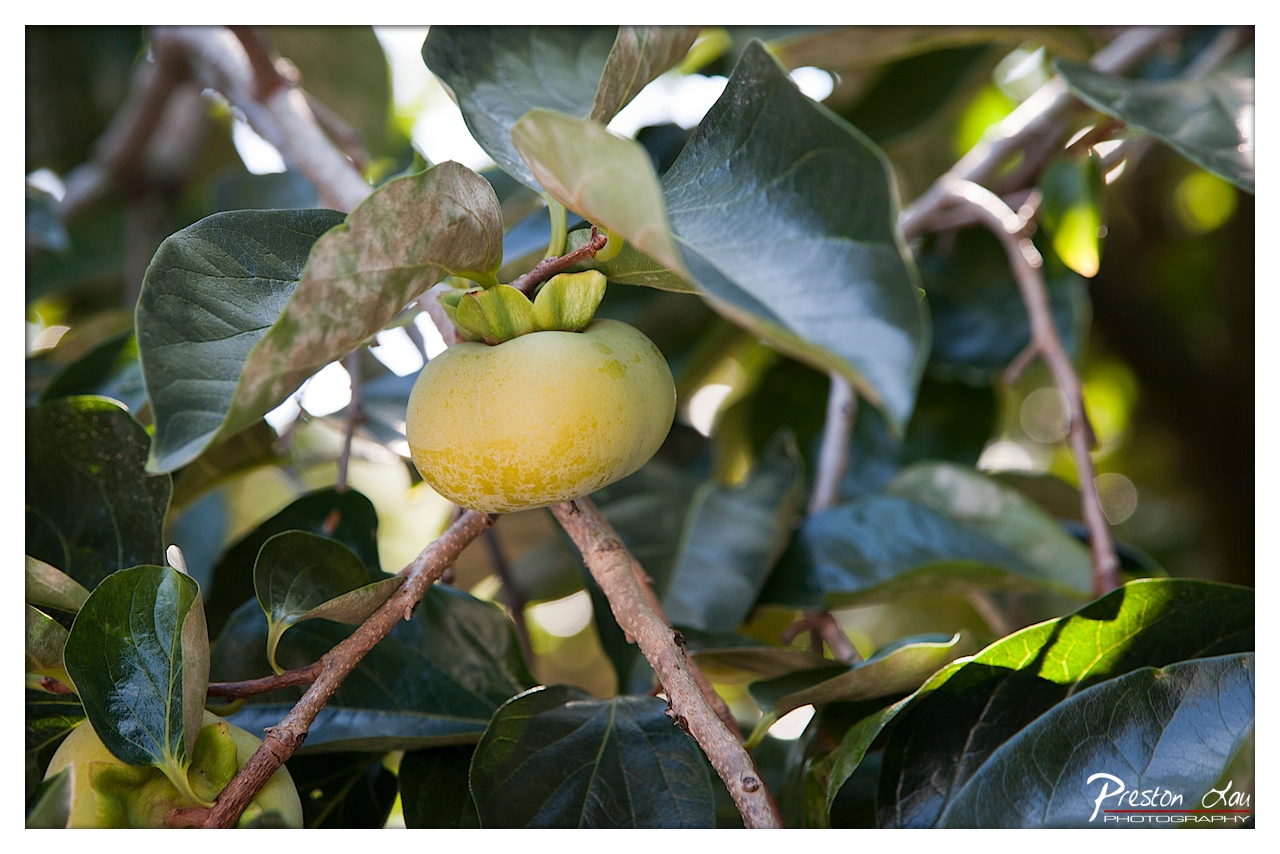 The palette is harmonious, with the pale yellow of the persimmon contrasting beautifully against the deep greens of the leaves. The subtle warmth of the tones evokes a sense of late summer or early autumn, and the natural color balance supports the image’s serene mood.