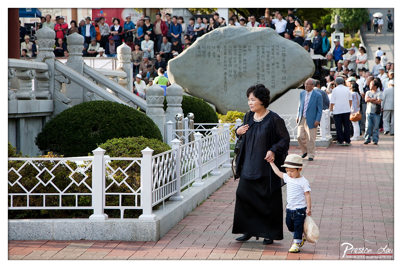 This photograph captures a quiet, intimate moment between a woman and a child amid a bustling public space, creating a compelling contrast between personal connection and collective activity. The candid nature of the subjects, combined with the cultural backdrop of the inscribed stone and traditional railings, imbues the image with narrative depth. While the composition is strong and emotionally resonant, the background crowd slightly distracts from the central figures, preventing the image from achieving greater visual cohesion.