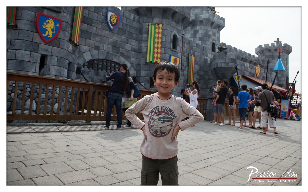 This photograph captures a joyful moment of childhood wonder at a theme park, where the boy’s confident pose and radiant smile anchor the image with warmth and personality. The castle backdrop, though slightly overcast, adds a sense of fantasy and narrative, grounding the scene in a place of imagination. While the lighting is flat and the background busy, the emotional authenticity of the subject makes the image compelling and memorable.