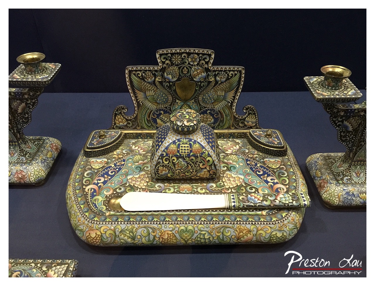 This photograph captures the intricate artistry of a Fabergé-style enamel desk set with remarkable clarity, showcasing its opulent details and symmetrical elegance. The rich ornamentation and jewel-toned palette evoke a sense of historical grandeur, though the flat lighting and slightly cluttered framing prevent it from achieving a more refined visual impact. The image succeeds as a document of craftsmanship, but it feels more like a museum catalog than a compelling artistic statement.