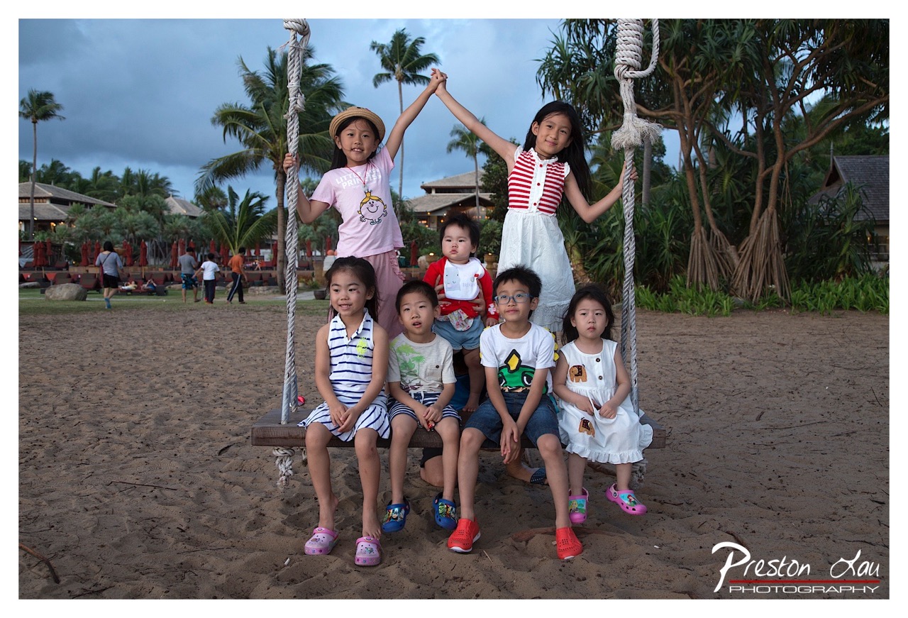 The image captures a unique moment—seven children sharing a swing in a tropical setting—which adds a layer of narrative and charm. The composition’s simplicity and focus on genuine interaction elevate it beyond a standard family photo.
