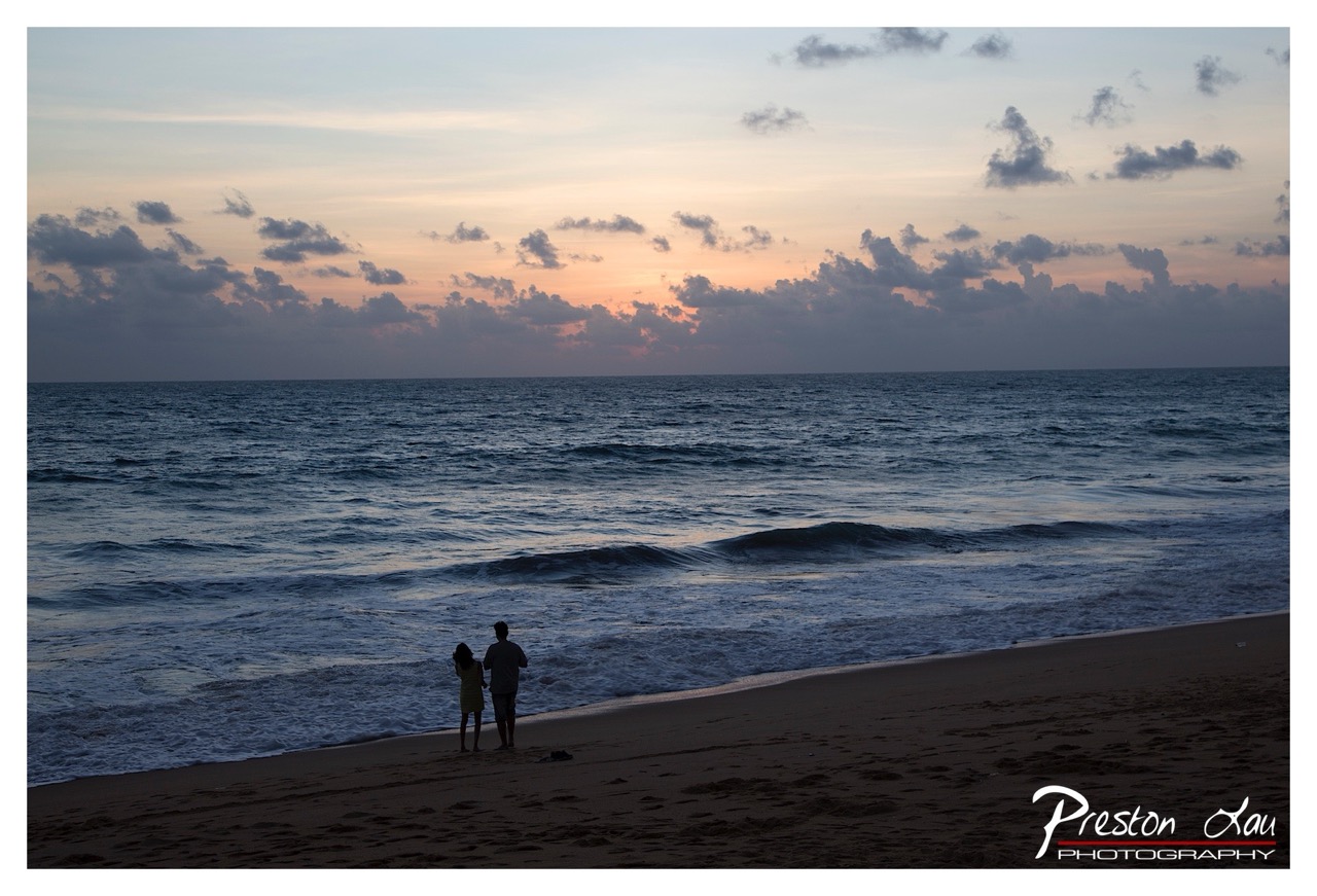 The couple is placed off-center, creating a balanced and natural composition that draws the eye across the frame. The diagonal line of the shoreline guides the viewer’s gaze toward the horizon, enhancing the sense of depth and scale.