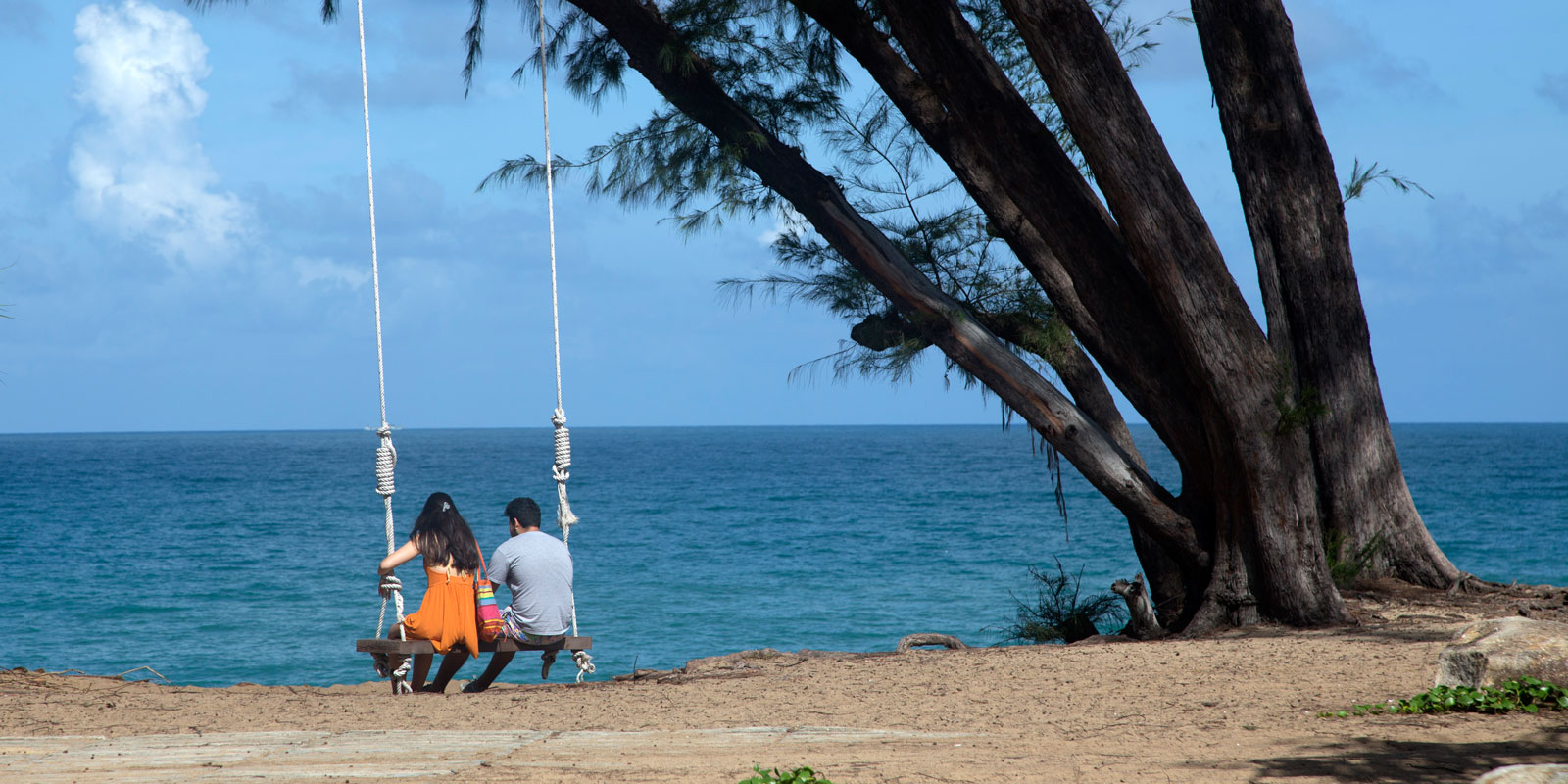 This photograph captures a serene and intimate moment between two people on a beach swing, framed by the quiet beauty of the ocean and a sprawling tree. The composition draws the eye naturally to the couple, evoking a sense of peace and connection, while the natural lighting and balanced colors lend a calm, contemplative mood. While the image is visually pleasing and emotionally resonant, it slightly lacks the dramatic tension or unique perspective that would elevate it beyond a beautiful snapshot.