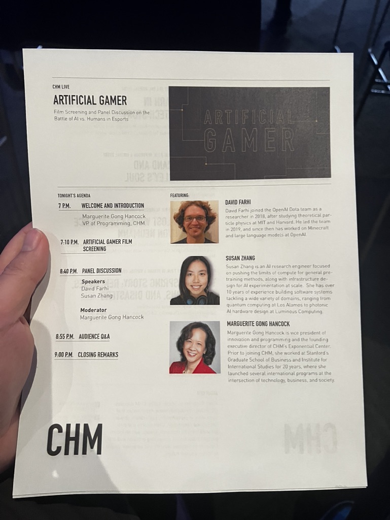 Following the screening, there is a panel discussion and Q&A featuring Open AI team’s David Farhi and Susan Zhang. Some backgroudn about David Farhi who is a research lead at OpenAI, where he led the DotA 2 project during its seminal achievement of superhuman performance in a top competitive e-sport. He studies reinforcement learning in complex environments and is especially interested in environments with unbounded emergent behavioral complexity. He completed his PhD at Harvard in theoretical physics and undergraduate degree at MIT.