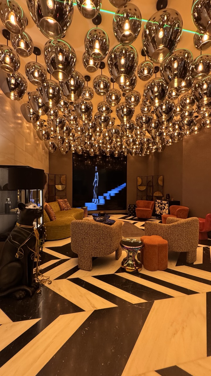 This photograph captures a luxurious and theatrical interior, where opulence and design intent converge in a visually arresting space. The cascading chandelier and bold geometric floor create a dynamic interplay of light and form, while the curated furniture and art installations lend a sense of narrative and personality. The image succeeds in conveying both grandeur and intimacy, though the sheer density of elements risks overwhelming the viewer’s eye.