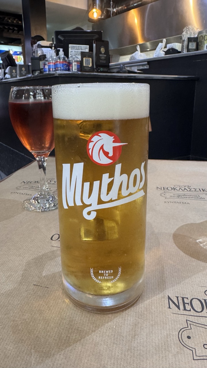 This photograph captures a casual yet inviting moment at a Greek restaurant, where the frothy glass of Mythos beer takes center stage with a sense of authenticity. The warm, ambient lighting and the visible restaurant interior lend a sense of place and occasion, while the presence of the second drink adds narrative depth. Though the composition is straightforward and the background slightly cluttered, the image succeeds in evoking a relaxed, social atmosphere—its charm lies in its unpretentious realism.