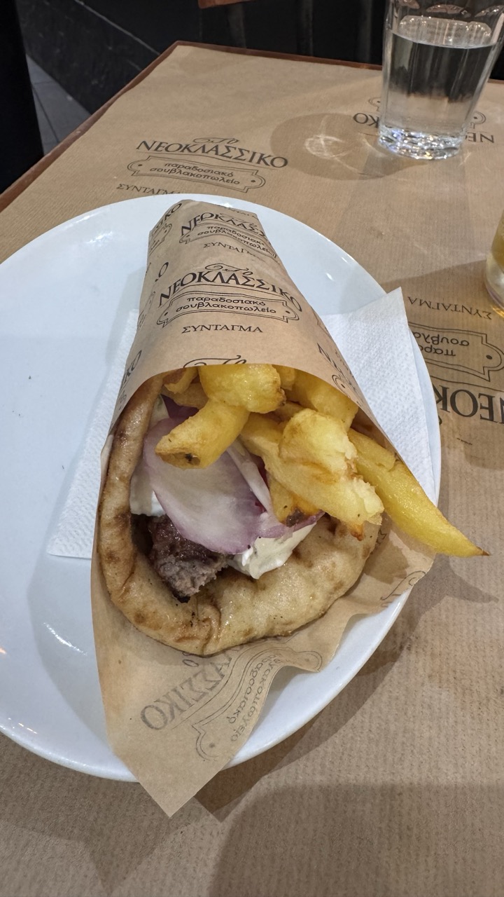 This photograph captures the hearty essence of a Greek gyro with a side of fries, served in a casual dining setting that feels authentic and unpretentious. The warm, earthy tones and the restaurant's branded paper create a sense of place, grounding the dish in its cultural context. While the composition is inviting and the subject is clearly appetizing, the slightly cluttered background and flat lighting prevent the image from achieving a more refined visual appeal.