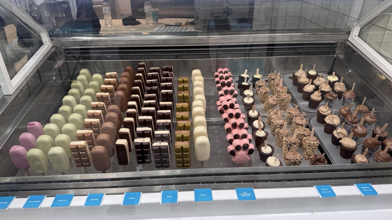 This photograph captures the inviting array of frozen treats in a well-organized display case, evoking a sense of indulgence and variety. The orderly arrangement of popsicles and chocolate-covered delights creates a visually satisfying rhythm, though the reflective glass and overhead lighting slightly obscure the richness of the textures. With its clean presentation and playful variety, the image succeeds as both a documentation of a dessert case and a subtle celebration of confectionery craftsmanship.