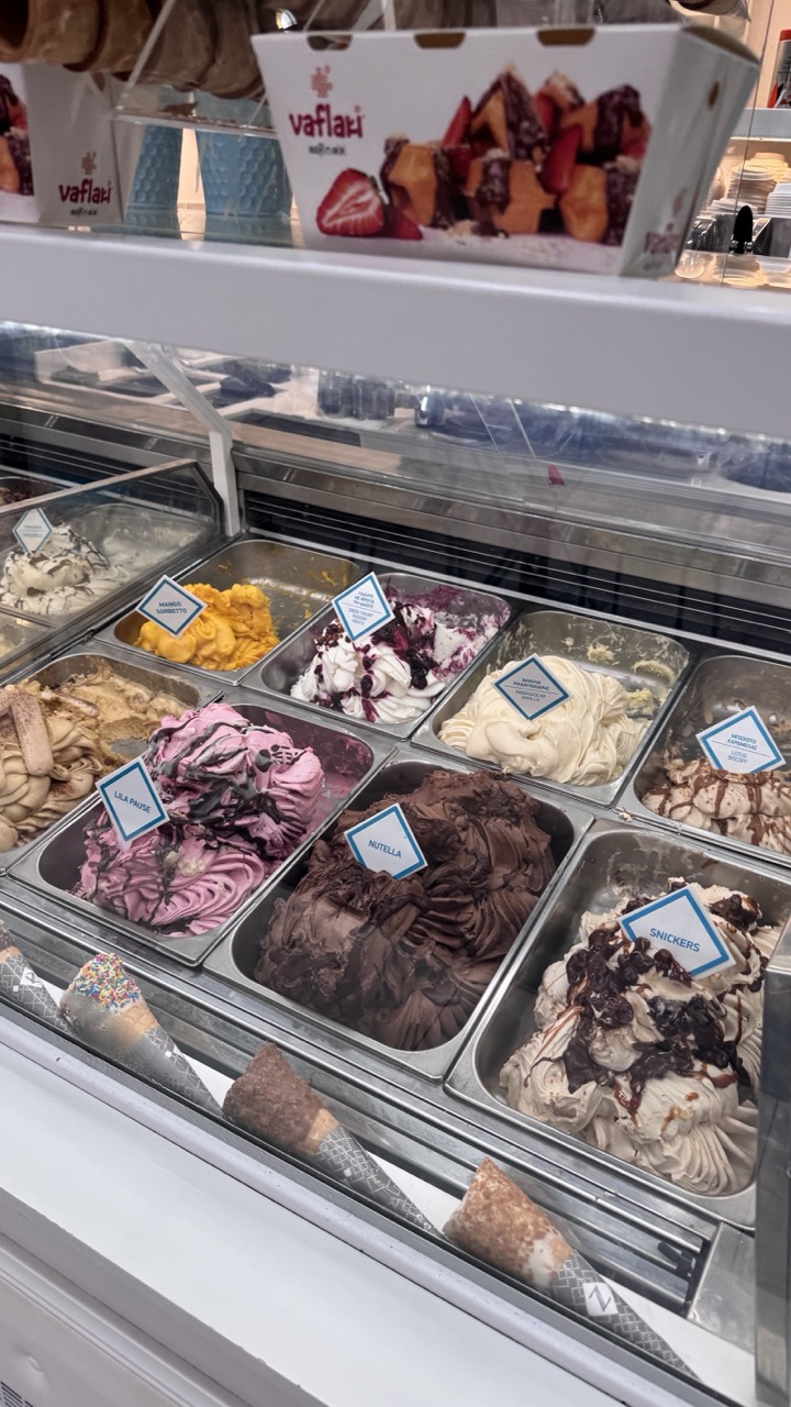 The lighting is bright and even, typical of a retail environment, which helps illuminate the colors of the gelato. However, the overhead lights create glare on the glass and produce a flat, clinical quality that diminishes the warmth and appeal of the scene.
