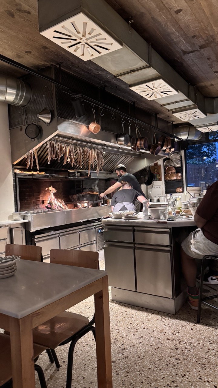 The diagonal line of the oven and the hanging pots guide the eye toward the central action, but the foreground table and chairs create visual noise. A tighter crop would improve balance and emphasize the chefs’ interaction with the fire.