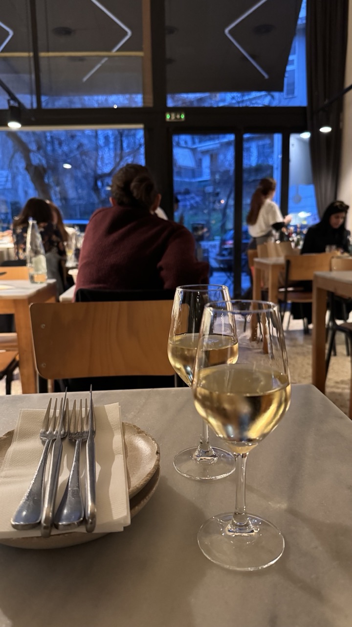 The foreground placement of the wine glasses and cutlery creates a strong visual anchor, guiding the eye into the softly blurred background. The diagonal lines of the table and window frames add subtle structure, though the composition is slightly asymmetrical, creating a natural, unposed feel.