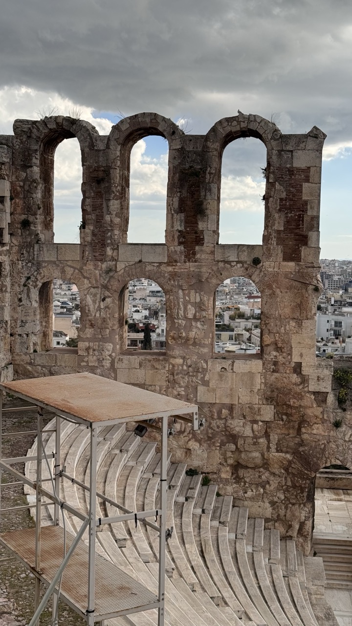 The table is positioned to lead the viewer’s gaze toward the Acropolis, creating a strong visual axis. The balance between the foreground dining setup and the expansive city view is well-handled, with the glass barrier adding depth without disrupting the composition.