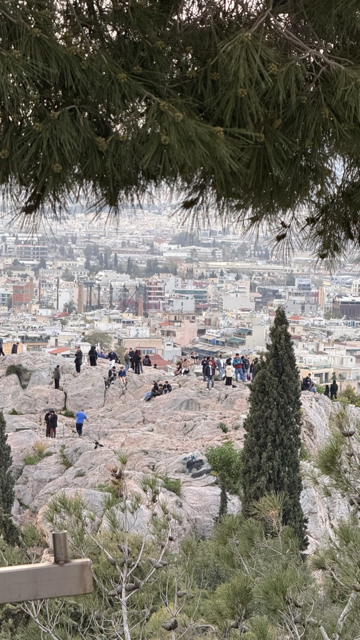 This photograph captures the timeless grandeur of the Acropolis against the vibrant backdrop of modern Athens, blending ancient history with contemporary life in a visually compelling way. The framing, with foreground foliage adding depth and texture, grounds the image in a sense of place and perspective. While the composition is strong and the subject iconic, the natural lighting and color balance could be more dynamic to elevate the scene beyond a standard travel snapshot.