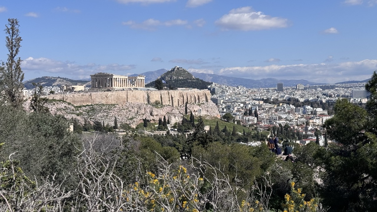 The layered composition—foreground branches, midground Acropolis, and background cityscape—creates a rich sense of depth. The placement of the Parthenon as a central focal point, balanced by the surrounding greenery, enhances visual harmony and guides the viewer’s eye naturally through the frame.