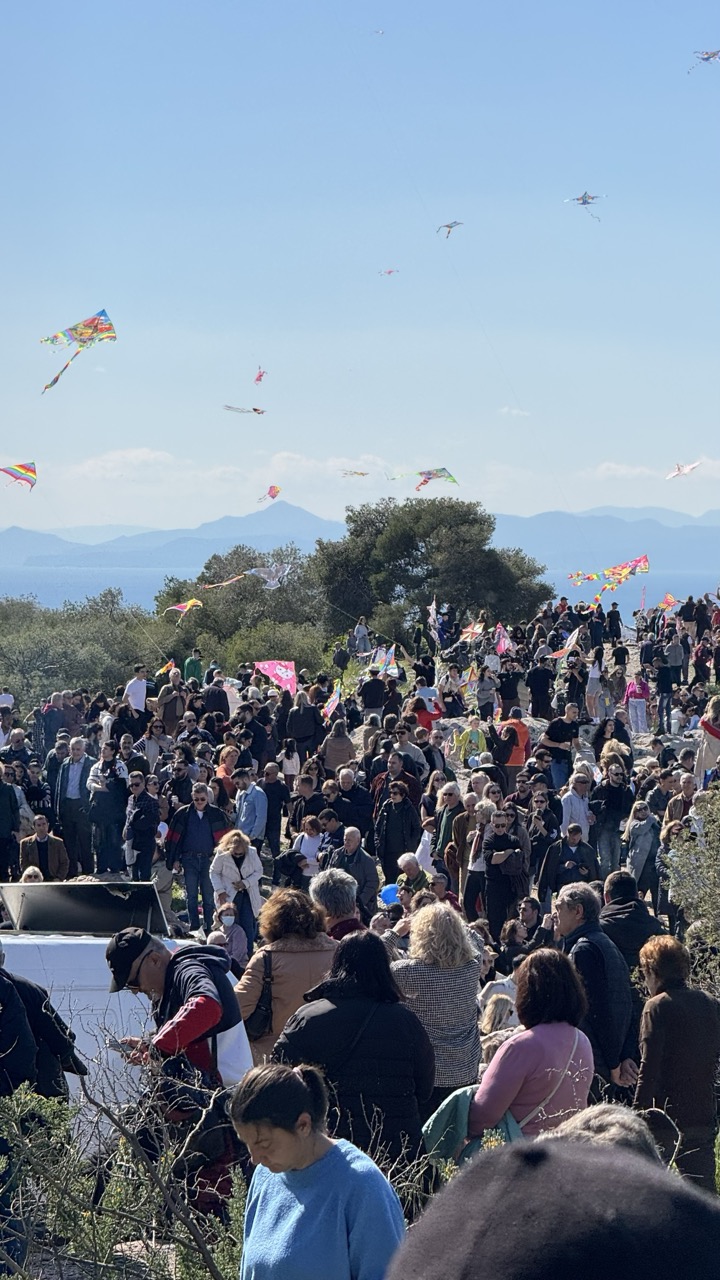 This photograph captures the exuberant energy of a vibrant kite festival, where a dense crowd gathers beneath a vast, cloudless sky. The composition balances the human presence with the soaring kites, creating a sense of collective joy and celebration against a backdrop of distant mountains and sea. While the image is rich in activity and atmosphere, its slightly chaotic framing and overexposed sky diminish its visual cohesion, leaving it more documentary than poetic.
