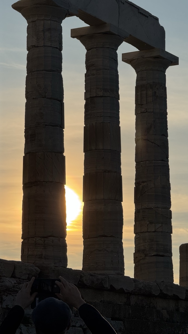 The vertical alignment of the columns creates a strong structural rhythm, with the sun positioned perfectly between two pillars to draw the eye. The inclusion of the photographer’s hands in the foreground adds depth and narrative context, though it slightly disrupts the symmetry.
