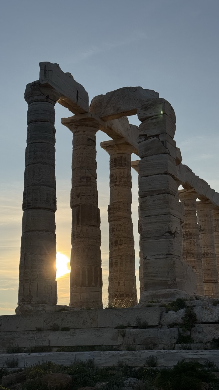 This photograph captures the timeless grandeur of ancient Greek architecture at sunset, where the interplay of light and ruin evokes a profound sense of history and reverence. The sun positioned between the columns creates a dramatic focal point, while the weathered stone and soft sky lend a contemplative, almost sacred atmosphere. Though the image is strong in mood and composition, the slightly overexposed sun and muted color palette keep it from achieving full visual resonance.
