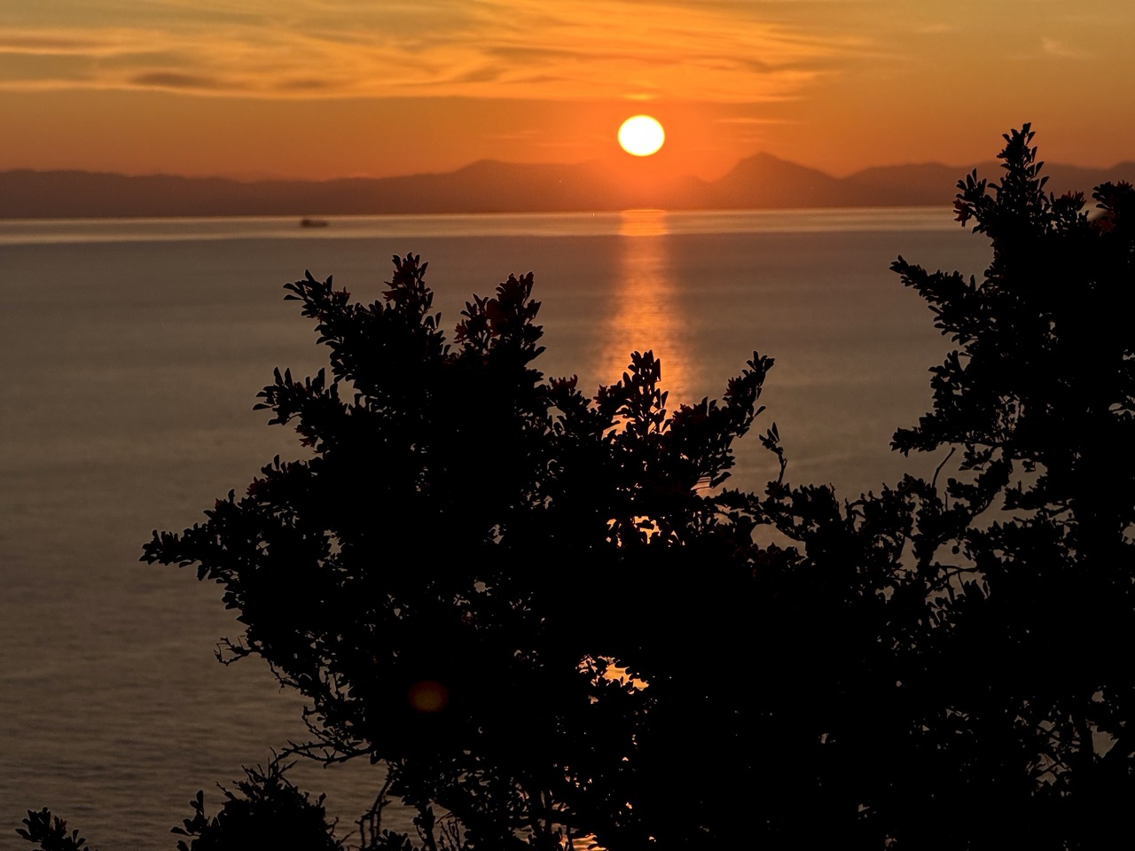 This photograph captures a serene and contemplative sunset over a vast expanse of water, where the golden sun dips behind distant mountains, casting a warm, luminous glow across the horizon. The silhouetted foliage in the foreground adds depth and a sense of intimacy, framing the scene as if viewed from a quiet vantage point. While the image is striking in its simplicity and color harmony, the deep shadows in the foreground slightly obscure detail, preventing it from achieving full visual richness.