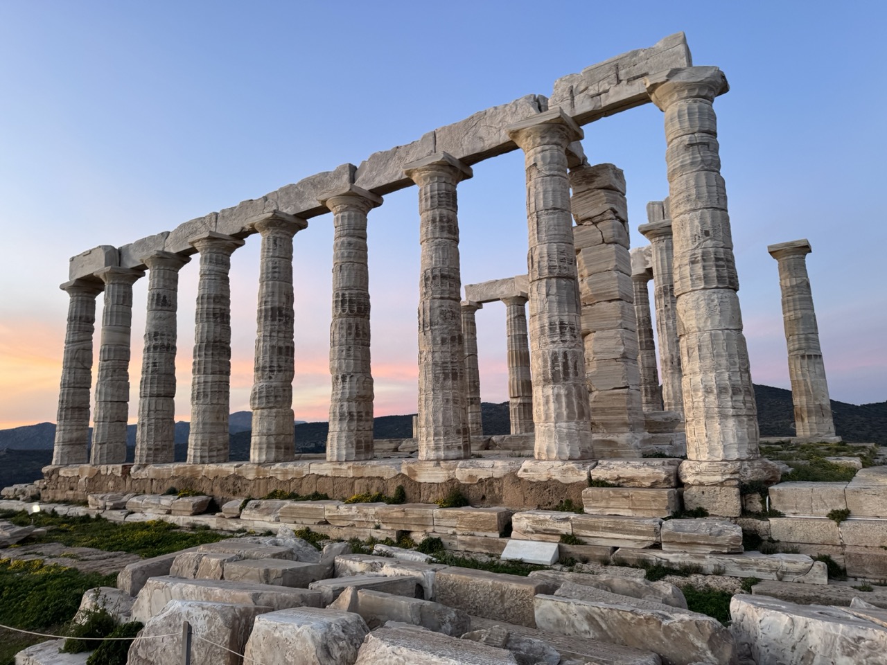 This photograph captures the timeless grandeur of the Temple of Poseidon at Cape Sounion, where ancient stone columns rise like sentinels against a soft, pastel sky. The warm glow of dusk bathes the weathered marble in a golden light, emphasizing both the monument’s enduring strength and its poignant decay. While the composition is strong and the moment beautifully captured, the image could benefit from slightly deeper contrast to enhance the texture of the stone and the drama of the light.