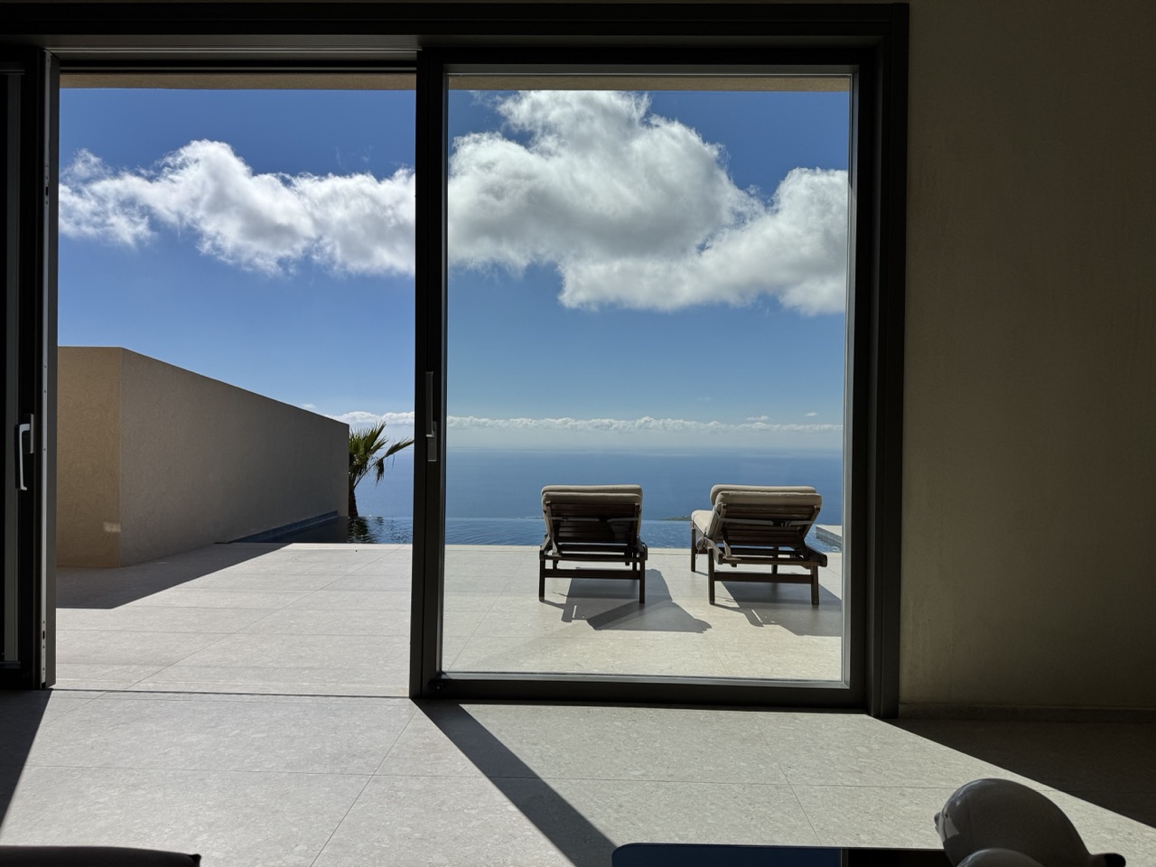This photograph captures a serene and luxurious escape, where the interplay of interior shadow and expansive outdoor light evokes a sense of calm contemplation. The clean lines of the modern architecture and the vast horizon create a harmonious balance between human design and natural grandeur. While the image excels in mood and perspective, its technical neutrality slightly tempers its emotional resonance, leaving it more as a snapshot of place than a deeply evocative moment.
