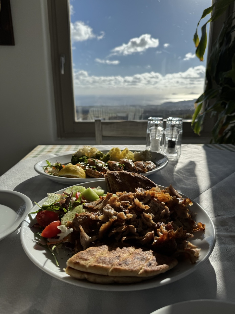 The image is conceptually straightforward—documenting a meal—but the choice of a textured plate and natural garnishes adds a touch of thoughtful presentation. It reflects a casual dining experience with a subtle nod to rustic elegance.