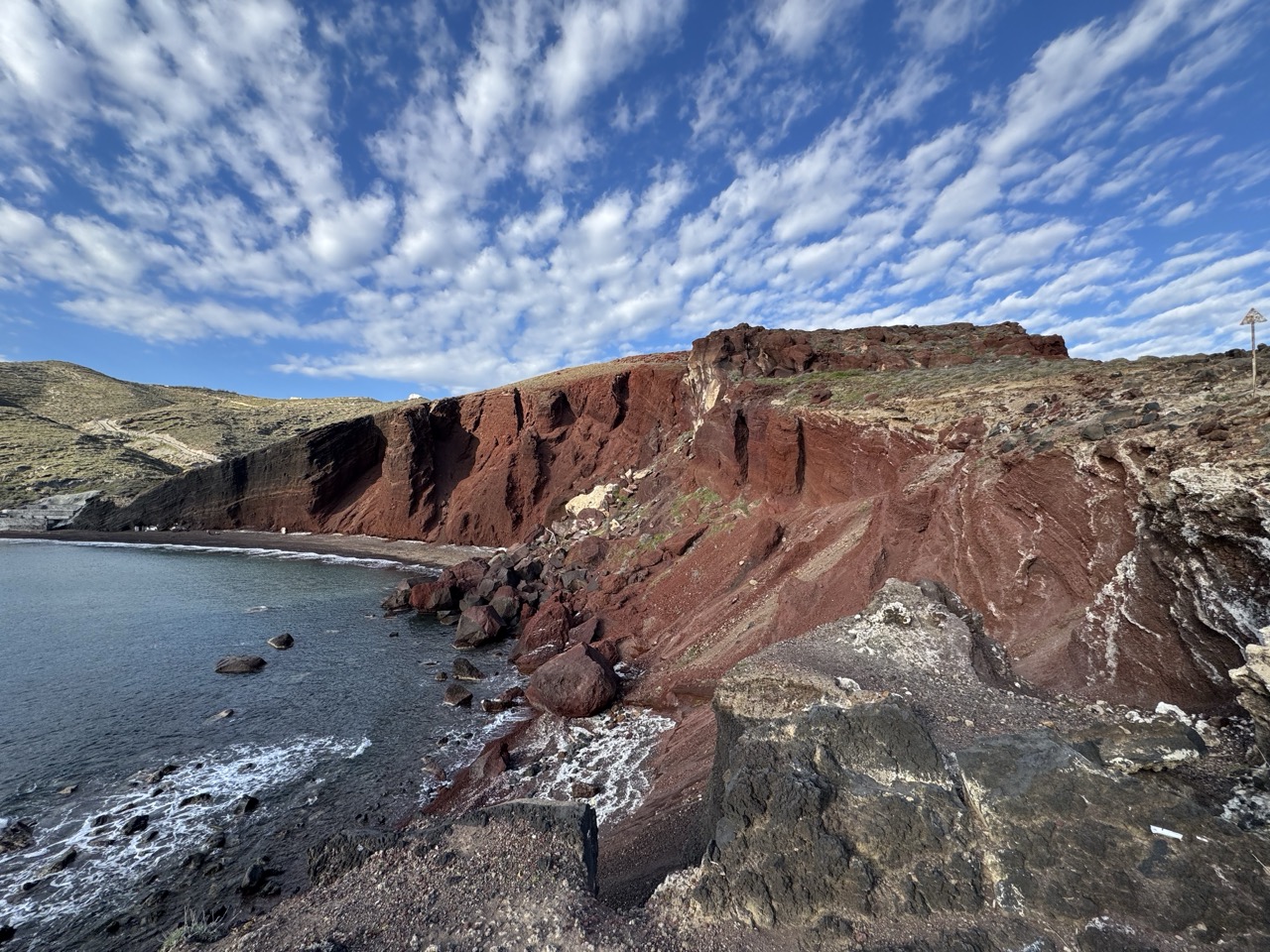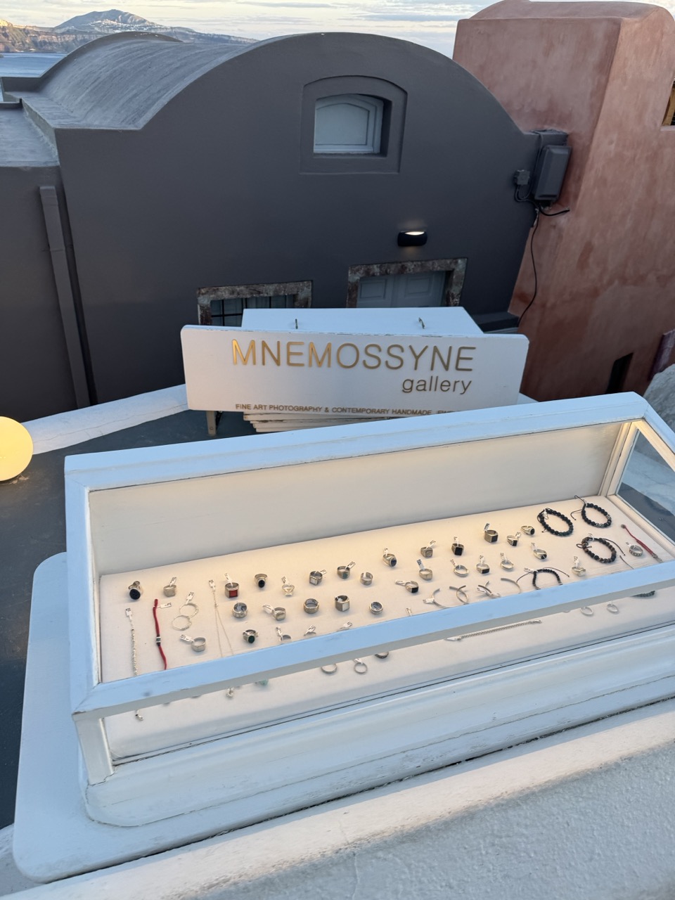This photograph captures a serene moment in a sun-drenched Mediterranean setting, where the quiet display of handmade jewelry harmonizes with the timeless architecture of Santorini. The composition balances the intimate detail of the gallery’s offerings with the expansive beauty of the caldera in the distance, creating a sense of place and purpose. While the lighting is slightly flat and the framing feels casual, the image succeeds in conveying both the artistry of the pieces and the soul of the location.