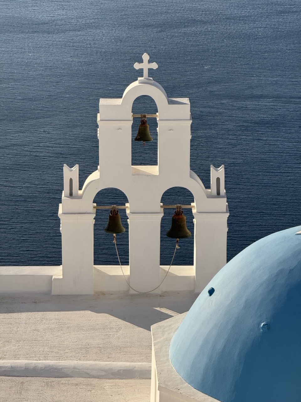 This photograph captures the serene harmony of Santorini’s iconic architecture against the vast, deep blue of the Aegean Sea. The clean lines of the white bell tower, crowned with a cross and flanked by weathered bells, stand in striking contrast to the textured blue dome in the foreground, creating a visually balanced and culturally rich composition. The image succeeds in conveying the timeless beauty of the Greek islands, though its strength lies more in its aesthetic clarity than in emotional depth.
