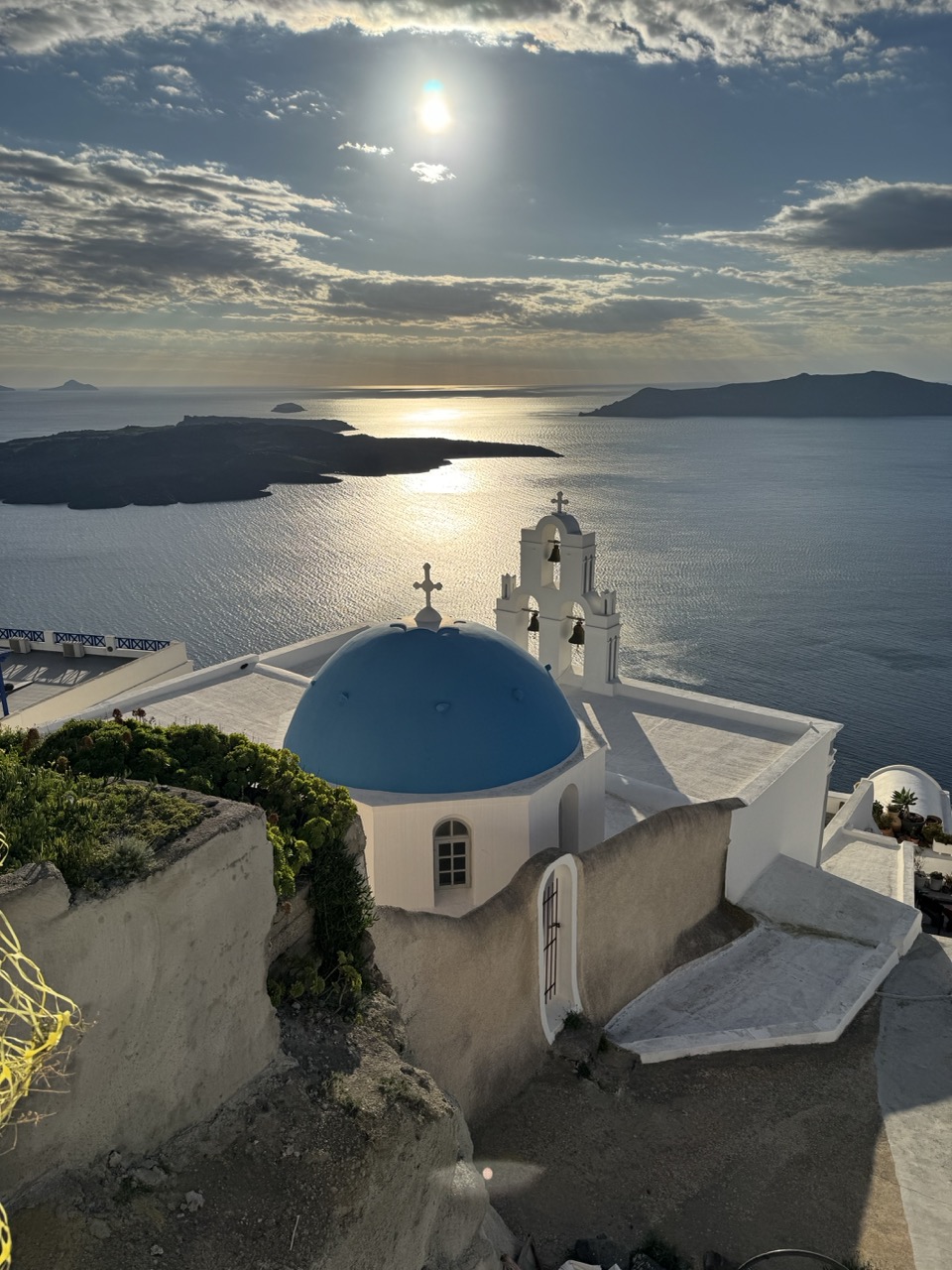 This photograph captures the timeless beauty of Santorini with a luminous, almost reverent quality, where the interplay of light and architecture evokes a deep sense of place. The iconic blue dome and white-washed structures stand in striking contrast to the vast, sun-dappled Aegean, while the sun’s rays piercing through the clouds add a spiritual glow. The image is visually compelling and emotionally resonant, though the slight overexposure in the sky tempers its overall subtlety.