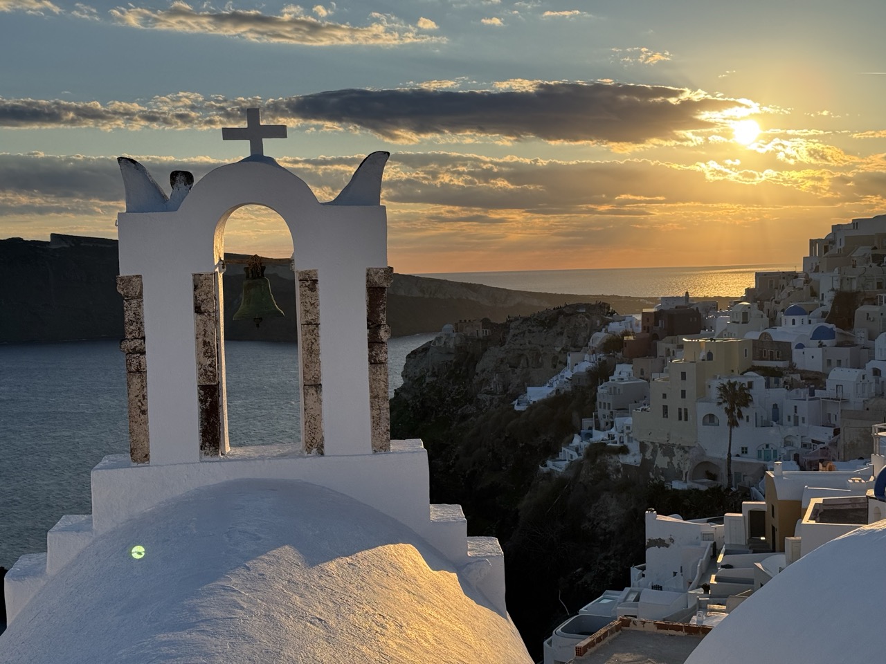 This photograph captures the serene grandeur of a Santorini sunset with striking clarity and emotional resonance. The white bell tower in the foreground acts as a strong visual anchor, leading the eye toward the radiant sun and the clustered Cycladic architecture below. While the composition is rich with iconic elements, the warm glow of the setting sun and the textured clouds lend the scene a poetic quality, making it both visually compelling and deeply atmospheric.