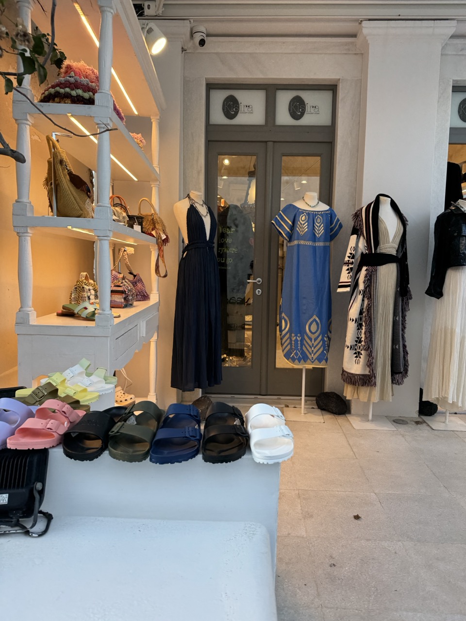 The image presents a straightforward documentation of a boutique’s exterior, capturing the essence of a seaside retail space. While the arrangement of products and lighting is effective, the lack of a unique angle or narrative twist limits its creative edge.