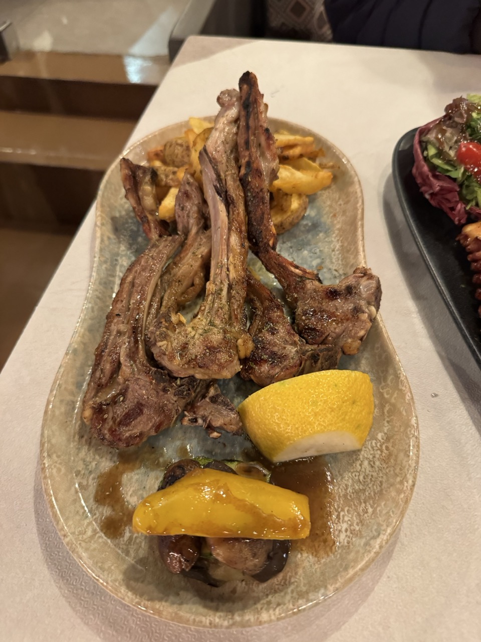 This image captures a hearty, well-prepared meal with a rustic charm, emphasizing the textures and colors of grilled lamb ribs and roasted vegetables. The composition is grounded in realism, with the dish presented as it would appear in a restaurant setting—unpretentious and inviting. While the lighting and framing are functional, they lack the dramatic polish that could elevate the image into something more visually compelling, leaving the focus on the food itself rather than the artistry of its presentation.
