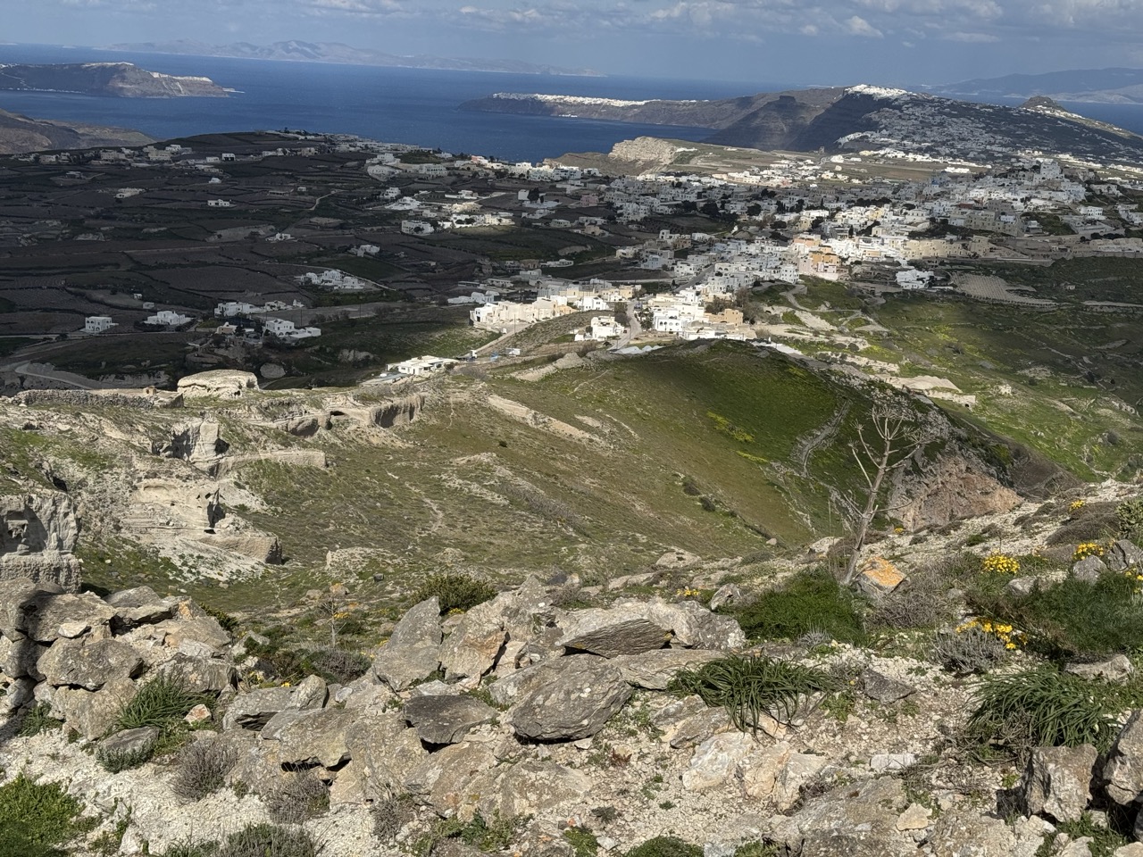 This panoramic view captures the stark beauty of a Cycladic island, where white-washed buildings cling to sun-baked hillsides under a vast, open sky. The composition balances the rugged foreground with the sprawling village and distant sea, creating a sense of both isolation and harmony. While the image is rich in natural texture and atmosphere, its slightly overexposed highlights and muted color palette temper its visual impact, holding it back from true artistic resonance.