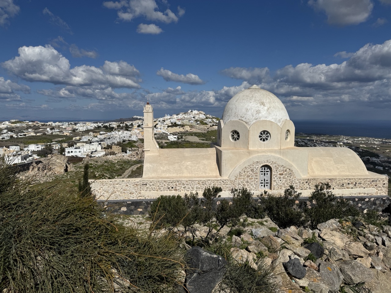 This photograph captures the serene beauty of a Cycladic church perched on a rocky hillside, with the white-washed village and deep blue sea stretching into the distance. The interplay of light and texture—sunlit stone, lush green shrubs, and dramatic clouds—imbues the scene with a timeless Mediterranean atmosphere. While the composition is strong and the mood evocative, the slightly overexposed sky and cluttered foreground detract from the image’s potential to feel truly transcendent.