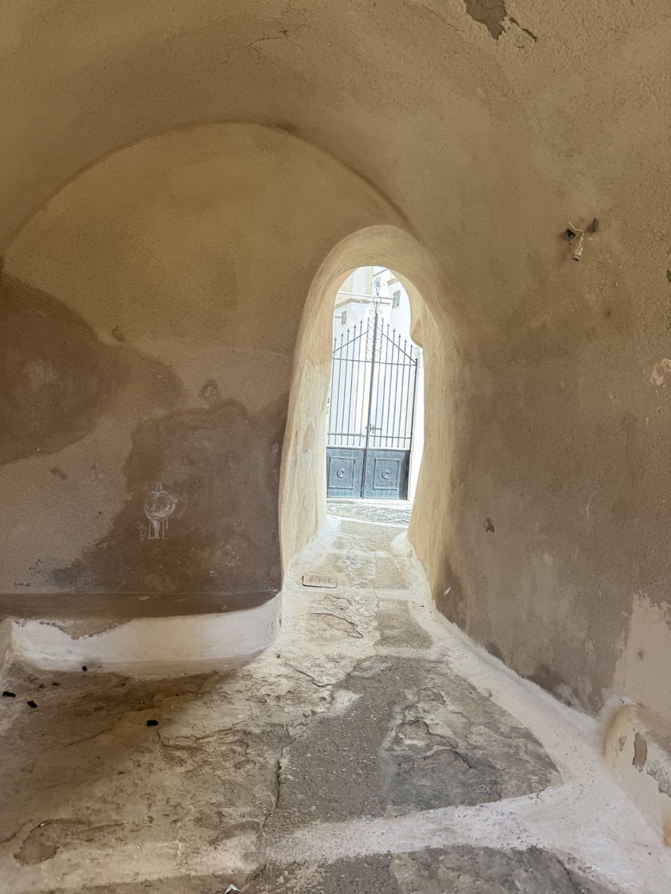 This photograph captures the quiet intimacy of a narrow, arched passageway, where time seems to have paused in a Mediterranean courtyard. The layered textures of weathered stucco and uneven stone lend a tactile sense of history, while the framing draws the eye toward the gate like a silent invitation. However, the muted lighting and lack of dynamic contrast slightly dampen the image’s potential, leaving it feeling more like a snapshot than a fully realized composition.