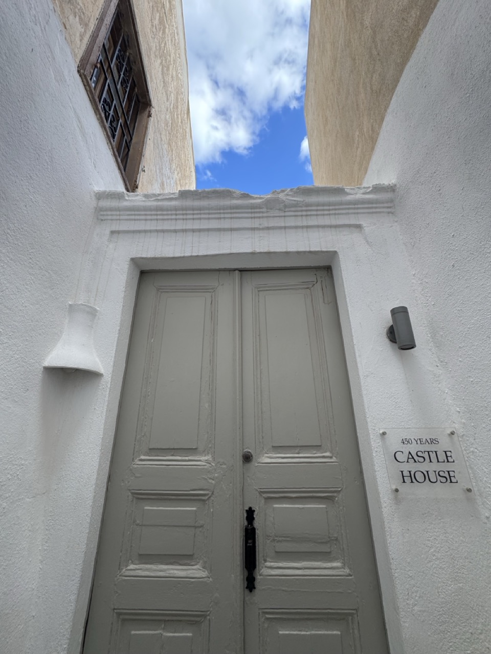 The narrow alley creates a strong leading line, guiding the viewer’s gaze through the frame toward the sky. The asymmetrical placement of the staircase and the house number adds visual interest, while the framing by the walls enhances the sense of intimacy.