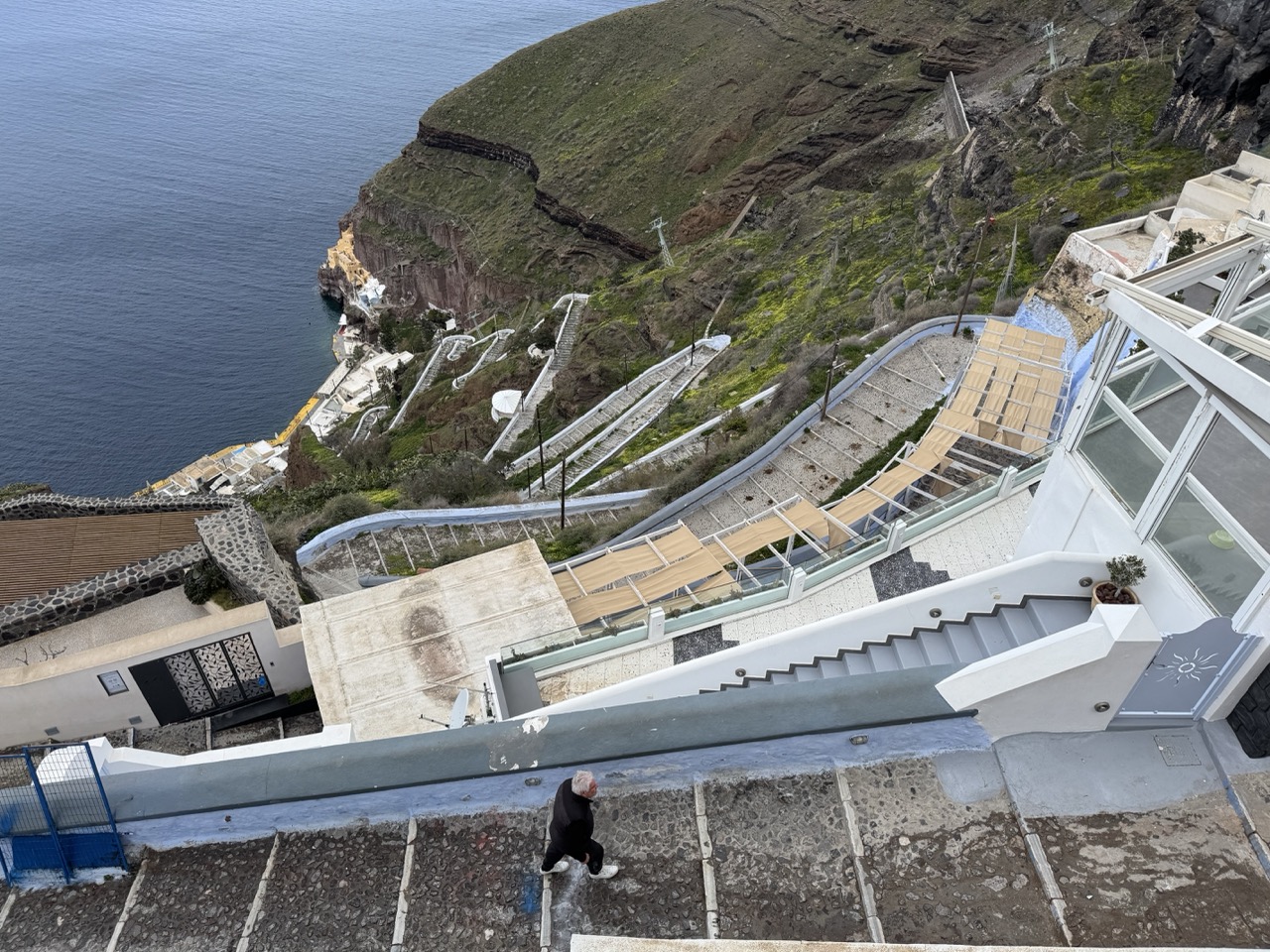 The high-angle perspective emphasizes the diagonal lines of the staircases, guiding the eye from the foreground down toward the sea. The placement of the lone walker adds balance and narrative, while the framing effectively captures the layered depth of the landscape, from the immediate steps to the distant shoreline.