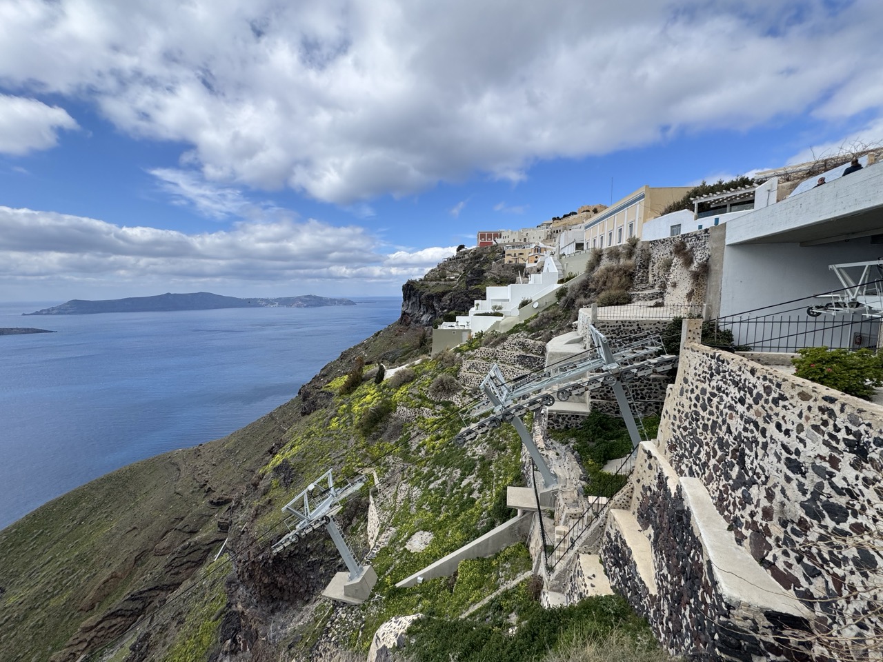 This photograph captures the dramatic juxtaposition of natural grandeur and human adaptation on a volcanic cliffside, evoking the timeless beauty of Santorini. The sweeping view of the Aegean Sea and the layered white architecture clinging to the slope create a powerful sense of place. While the composition is strong and the scene inherently dramatic, the presence of modern cable car infrastructure slightly disrupts the romanticized ideal of the island’s traditional charm.