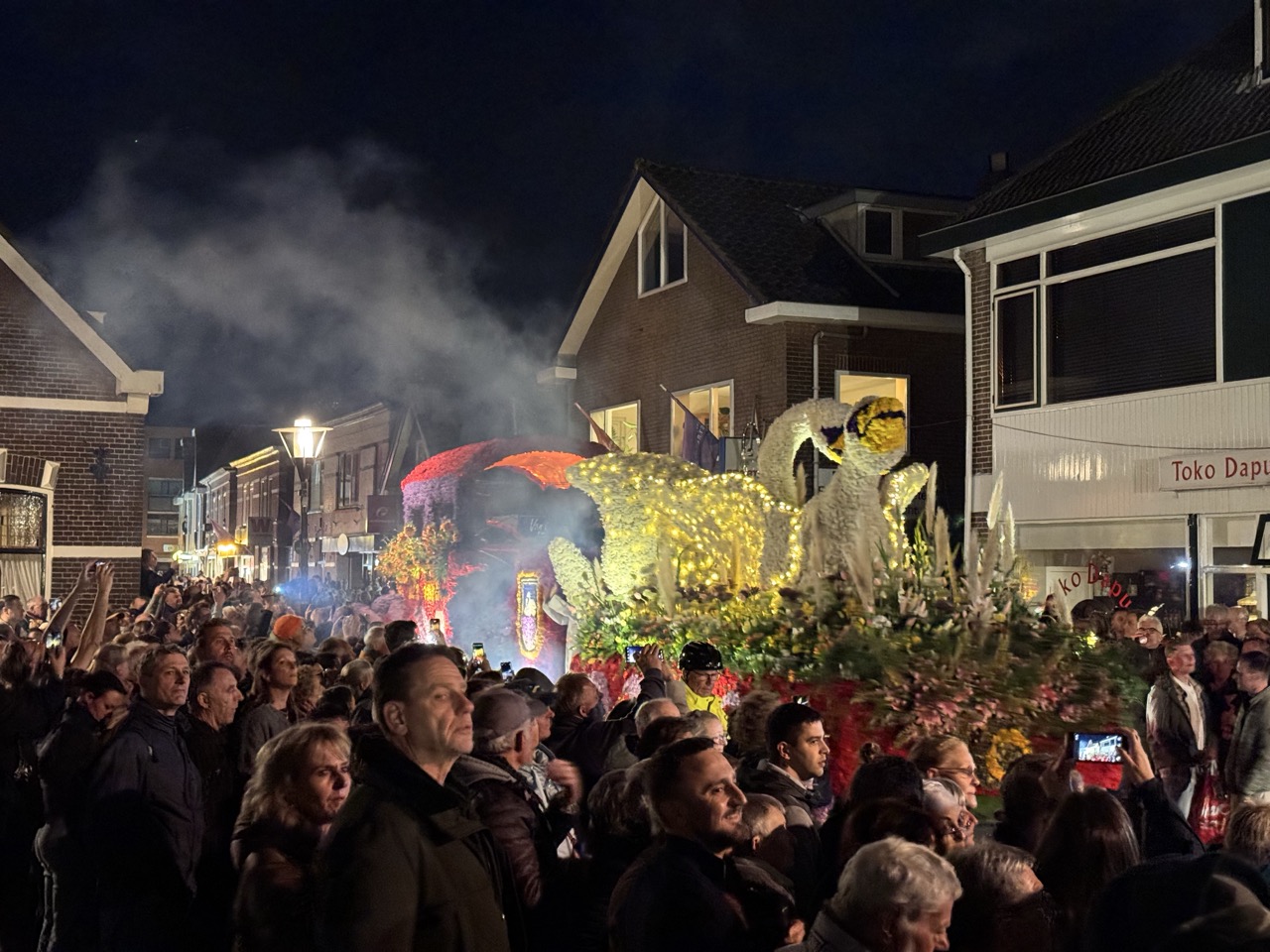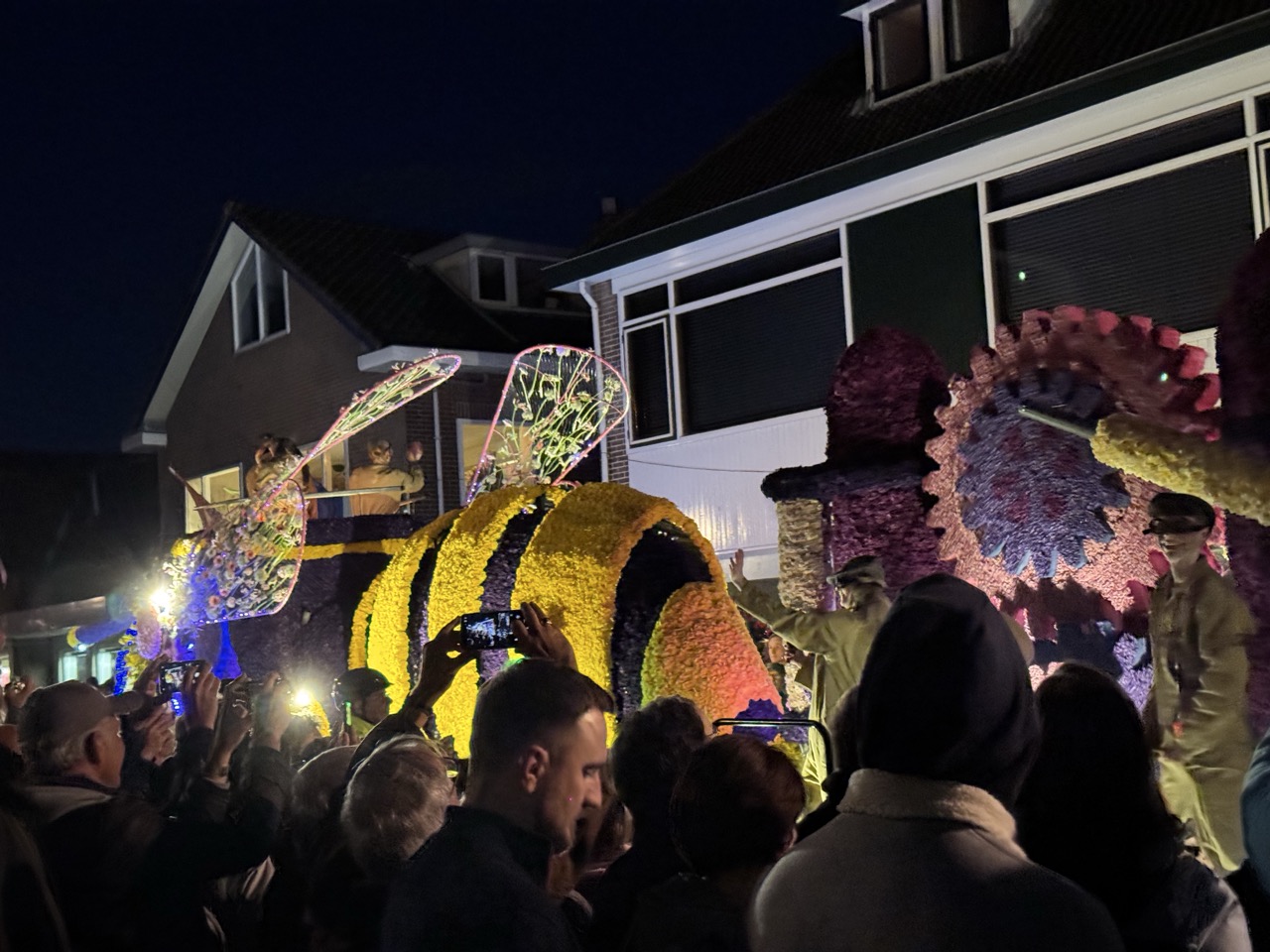 But we had timed our visit well, because April in the Netherlands is something else entirely. The evening before the main Flower Parade, the floats make their way through the streets illuminated after dark, and this is honestly where the whole thing tips from impressive into surreal. Imagine these vast, elaborate constructions — already extraordinary in daylight — now glowing from within and outlined against the night sky, every petal and carefully arranged bloom catching the light in a way that makes the whole display feel almost otherworldly. The crowds lining the streets had a different energy too, quieter and more absorbed than a daytime event, as if everyone watching had collectively agreed to just take it in. It is one of those things you find yourself struggling to describe afterwards because the visual is so far outside of normal reference points.