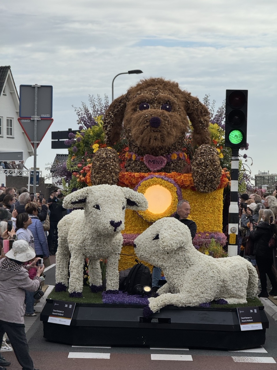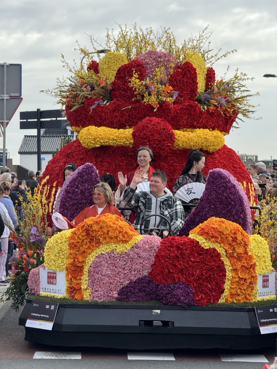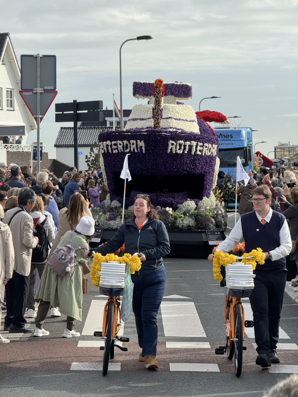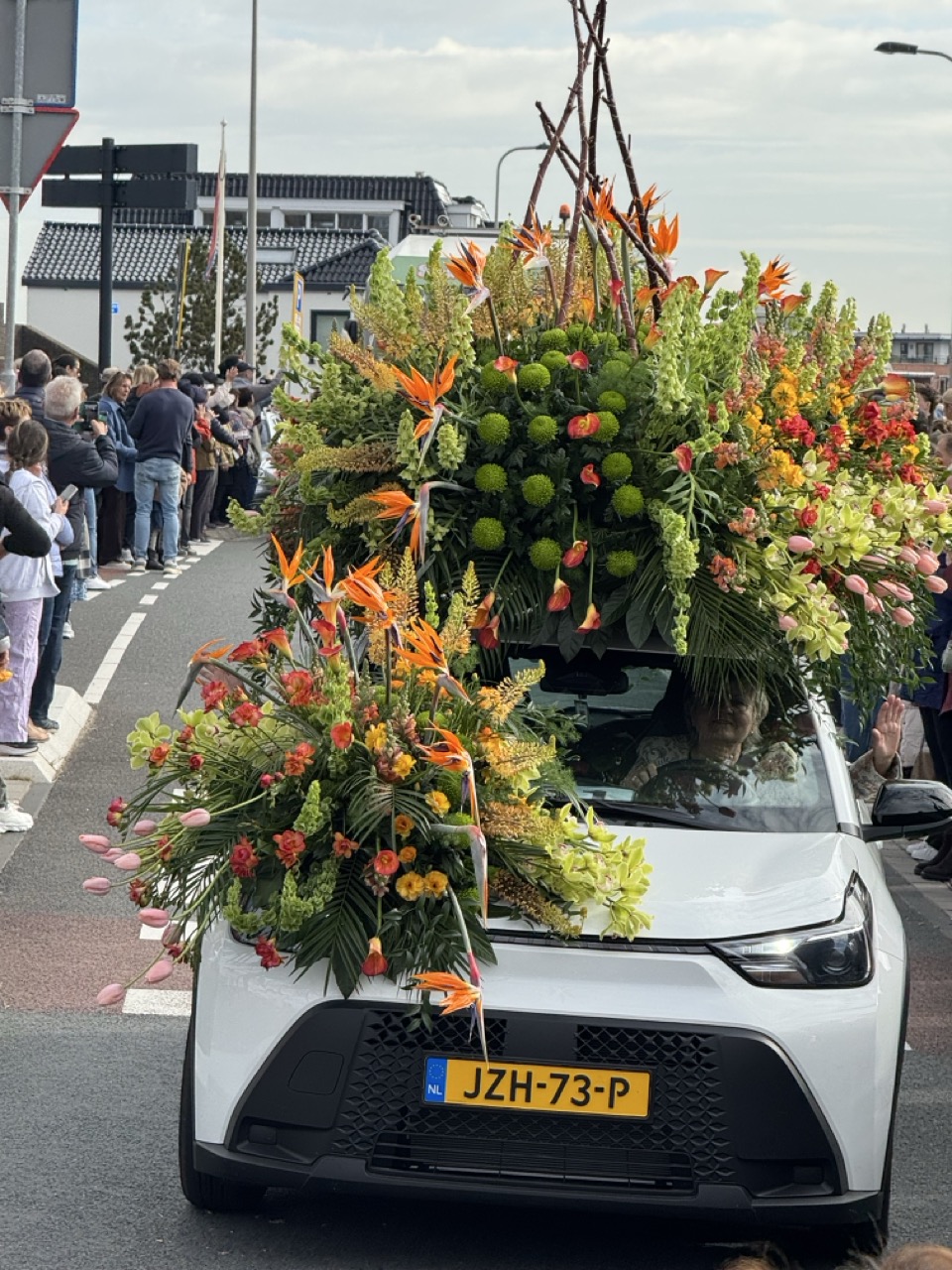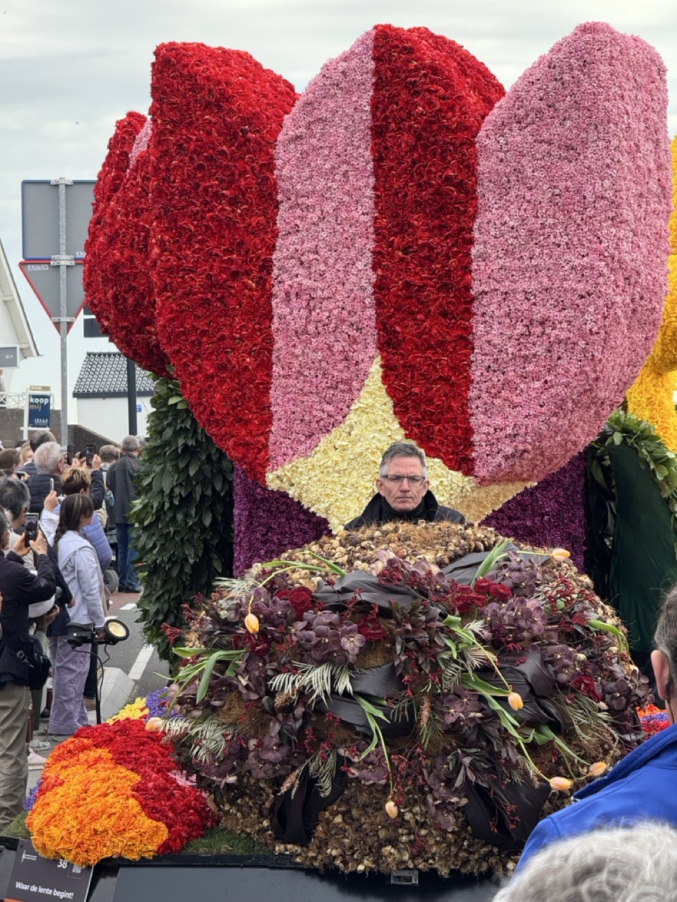 Then the following morning, the main event. The world-famous Flower Parade of the Bollenstreek travels its colorful 42-kilometre route from Noordwijk to Haarlem, passing Keukenhof along the way. The floats are not modest affairs. These are enormous, elaborate constructions covered entirely in fresh flowers, petals arranged into intricate patterns and sculptures that somehow stay coherent at parade speed. Having already seen them the night before in the dark, seeing them again in full daylight gave us a completely different perspective, and somehow they managed to be even more impressive the second time around.