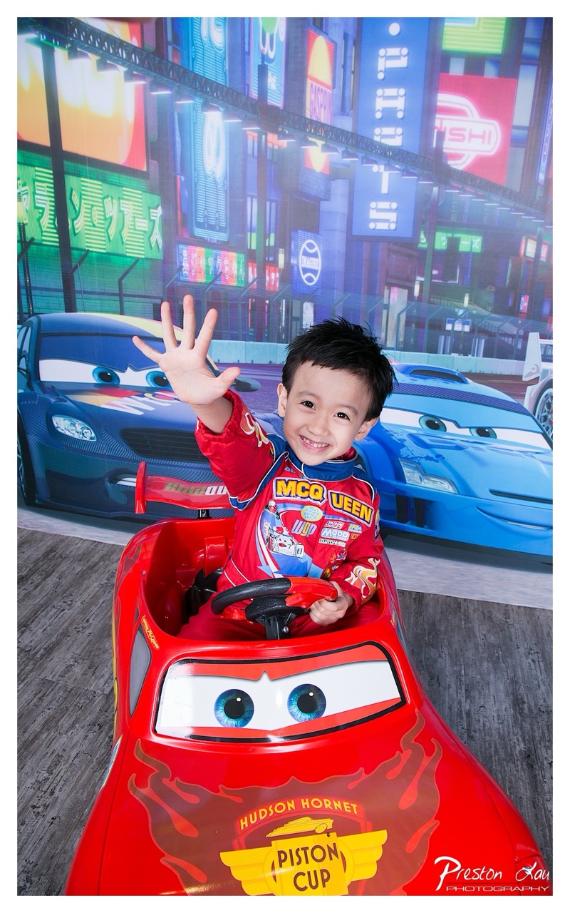 This photograph captures a joyful, imaginative moment, blending a child’s enthusiasm with the vibrant world of *Cars*. The bright colors and playful setup create an immediate sense of fun and energy, while the child’s genuine smile adds warmth and authenticity. While the scene feels staged, its charm lies in the child’s connection to the character and the vivid backdrop, making it a strong portrait of youthful wonder.
