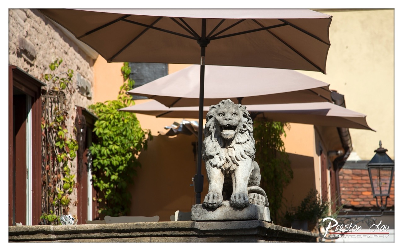 The image succeeds in blending the historic with the everyday, turning a simple street scene into a narrative moment. The choice to frame the lion as a guardian figure amid modern café umbrellas introduces a subtle juxtaposition of time and place.