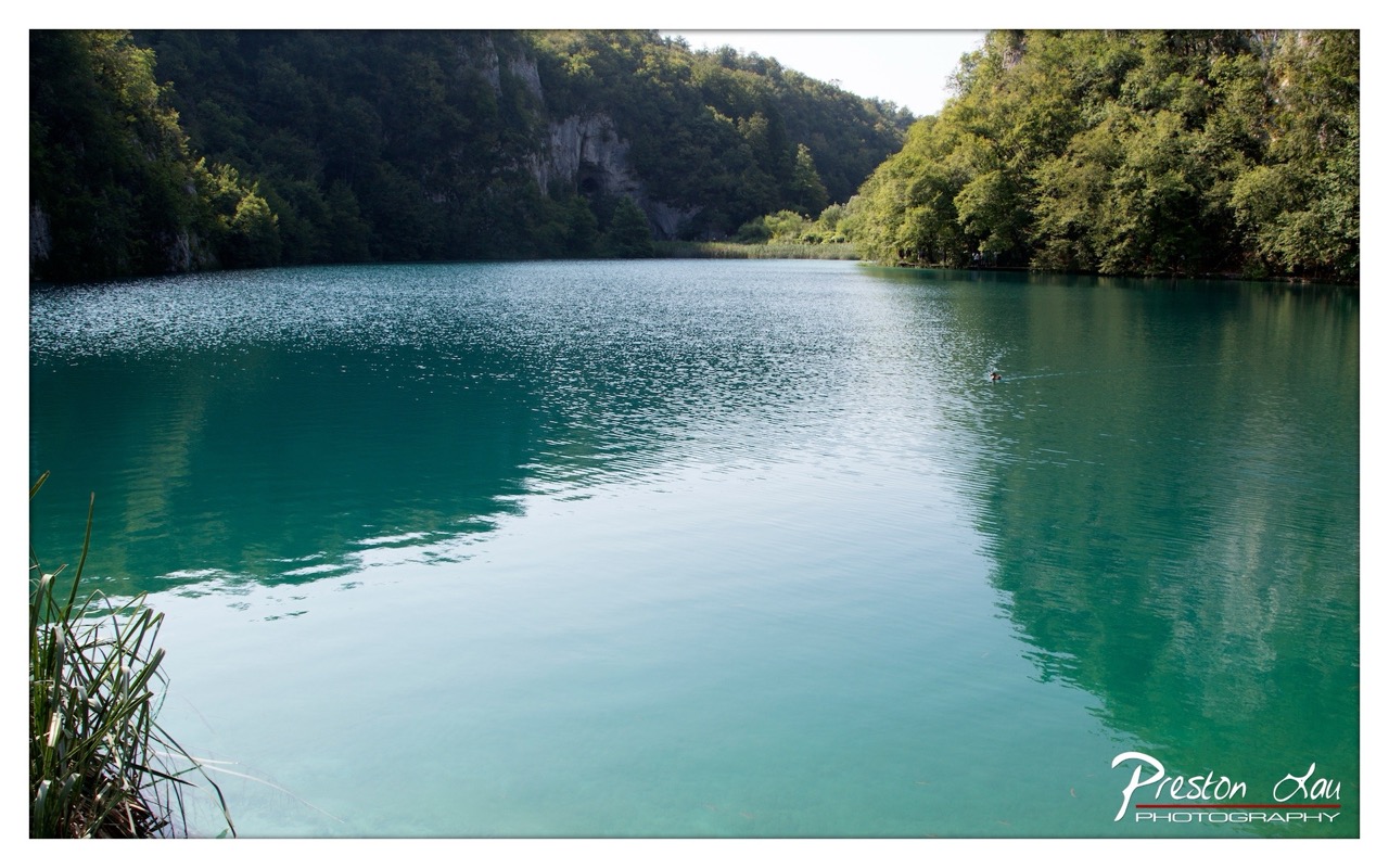 This photograph captures the serene majesty of a turquoise lake nestled within a lush, forested valley, evoking a sense of untouched natural wonder. The water’s vibrant hue and the rich green foliage create a visually harmonious palette, while the lone figure on the lake adds a subtle human scale without disrupting the tranquility. The image is compelling in its simplicity, though it occasionally leans toward the picturesque, slightly sacrificing raw authenticity for aesthetic polish.