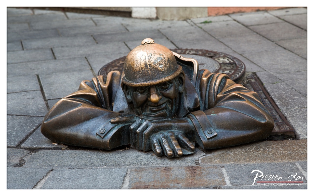 This photograph captures a whimsical and clever urban sculpture with a striking sense of realism and character. The bronze figure, appearing to emerge from a manhole, is rendered with meticulous detail, giving it a lifelike presence that draws the viewer in. While the composition is strong and the subject engaging, the muted urban backdrop slightly diminishes the overall visual drama, leaving room for greater atmospheric tension.