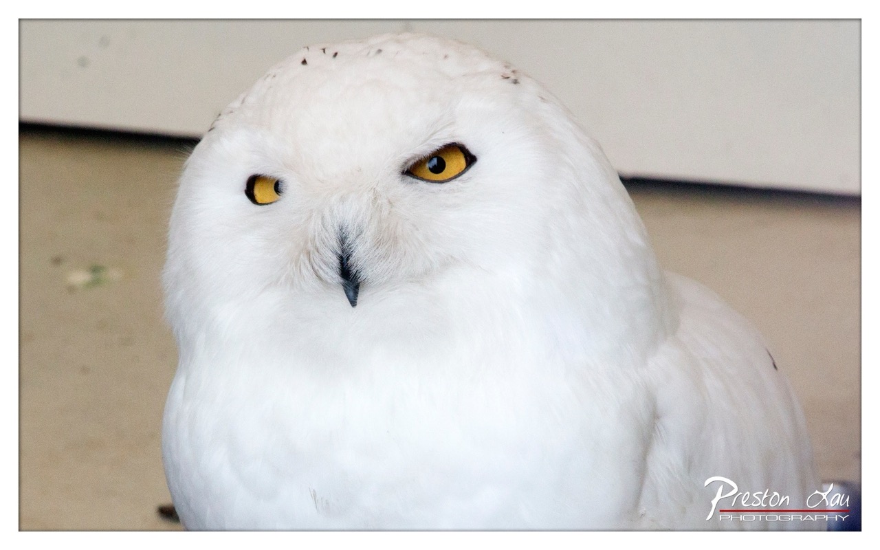 The monochromatic white of the owl’s feathers is beautifully contrasted by the vibrant yellow of its eyes, creating a strong visual punch. The neutral background supports the subject without competing, while the warm tone of the floor adds subtle context.