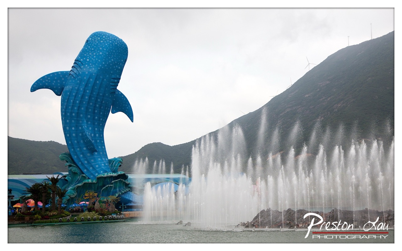 The Chimelong Ocean Kingdom aquarium in Zhuhai, China features a large aquarium with whale sharks, beluga whales, dolphins, and other marine animals. It has been ranked as the world's largest aquarium with 48.75 million liters of water, offering various shows, including submarine rides and dolphin performances, as well as nighttime firework displays on a central lake.