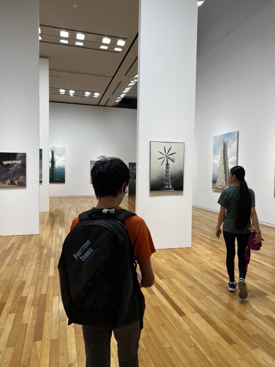 The image functions as a straightforward documentary record of an art visit. While the juxtaposition of the viewer with the surreal paintings suggests a layer of interpretation, the execution remains conventional, lacking bold artistic risk or narrative depth.