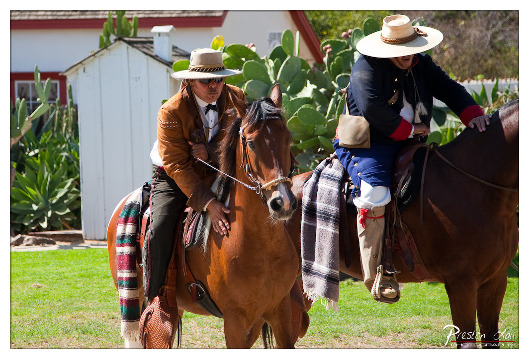 This photograph captures a vivid moment of cultural tradition, where two riders in period attire sit atop their horses in a sun-drenched, pastoral setting. The rich textures of the leather, fabric, and cacti, combined with the natural sunlight, lend an authentic, almost cinematic quality to the scene. While the composition feels slightly unbalanced and the lighting is harsh, the image succeeds in conveying a sense of heritage and quiet dignity.